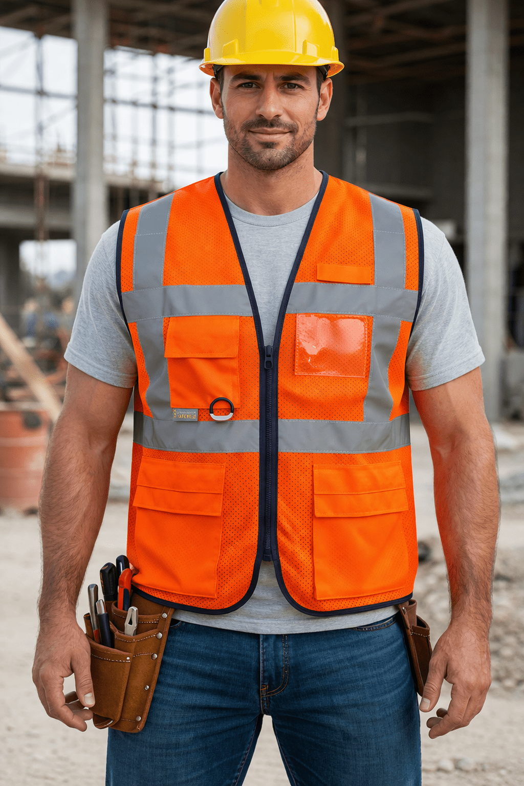 Turuncu Reflektörlü Yelek – Çok Cepli Yüksek Görünürlüklü Şantiye ve Yol Çalışma Yeleği