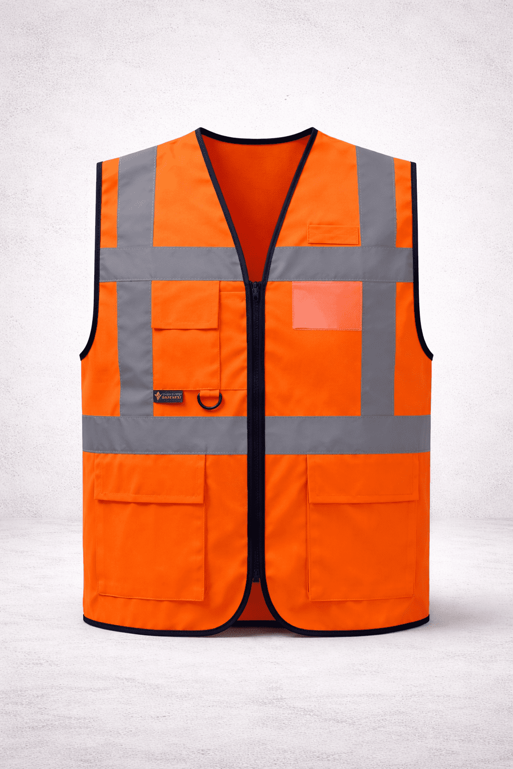 Turuncu Reflektörlü İş Güvenliği Yeleği – Çok Cepli Hi-Vis Şantiye Yeleği